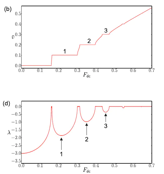 Dynamics of driven dissipative Frenkel-Kontorova model is examined by using largest Lyapunov exponent computational technique. Obtained results show that besides the usual way where behavior of the system in the presence of external forces is studied by analyzing its dynamical response function, the largest Lyapunov exponent analysis can represent a very convenient tool to examine system dynamics. In the dc driven systems, the critical depinning force for particular structure could be estimated by computing the largest Lyapunov exponent. In the dc+ac driven systems, if the substrate potential is the standard sinusoidal one, calculation of the largest Lyapunov exponent offers a more sensitive way to detect the presence of Shapiro steps. When the amplitude of the ac force is varied the behavior of the largest Lyapunov exponent in the pinned regime completely reflects the behavior of Shapiro steps and the critical depinning force, in particular, it represents the mirror image of the amplitude dependence of critical depinning force. This points out an advantage of this technique since by calculating the largest Lyapunov exponent in the pinned regime we can get an insight into the dynamics of the system when driving forces are applied.
